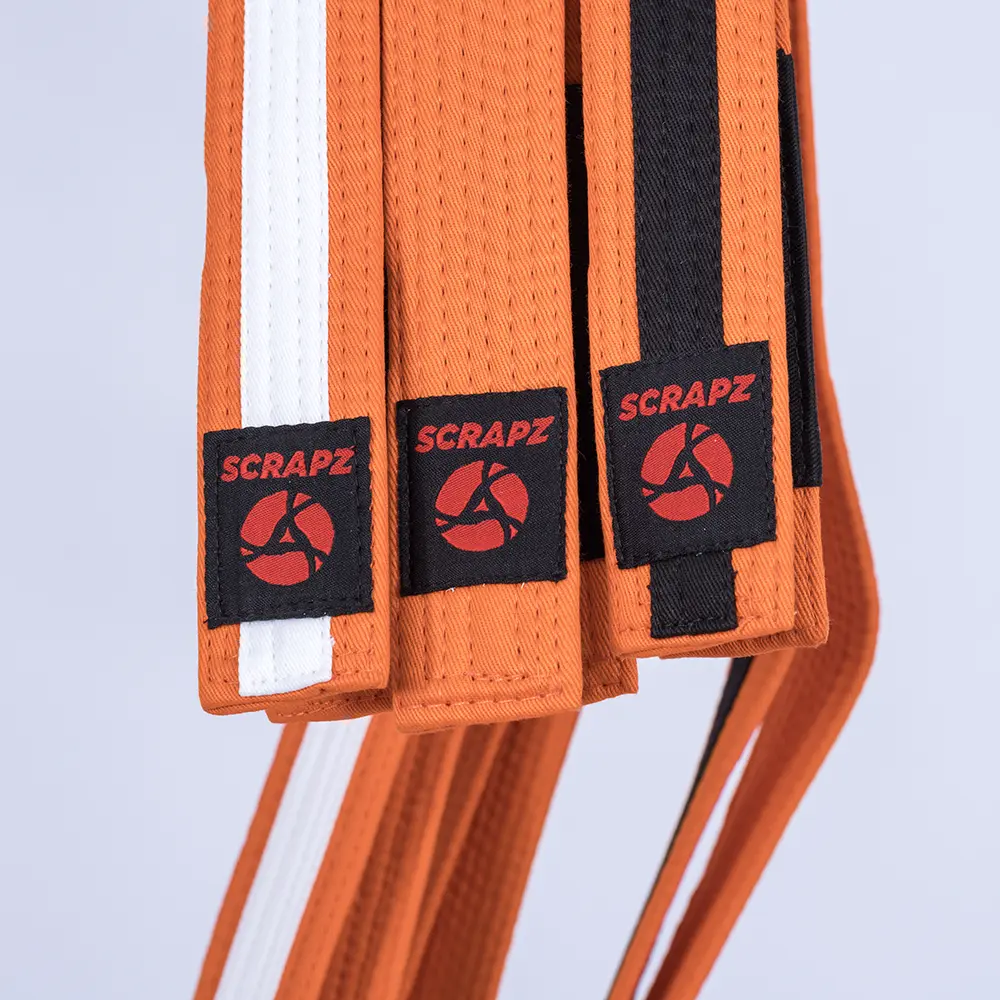 Bältet har 8 st rader söm på bältet, detta ger ett bälte som kommer hålla länge. Den svarta delen på bältet är ca 10 cm långt och ger gott om plats för streckgraderingarna, dvs tränaren tejpar på maximalt 4 st streck innan det är dags för nästa bälte. På andra änden av bältet sitter en svart vävd patch med Scrapz loggan i rött. Bältet finns i färgerna: vit, grå/vit, grå, grå/svart, gul/vit, gul, gul/svart, orange/vit, orange, orange/svart, grön/vit, grön och grön/svart. Bältet finns också i storlekarna M0, M1, M2, M3, M4.